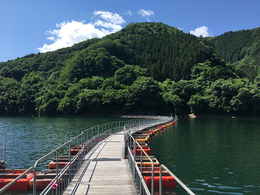 バス停「小河内神社」で下車すると、目の前に見えるのが麦山浮橋(通称ドラム缶橋)です。テレビの撮影にもよく使われる有名スポットです。湖面ぎりぎりをゆらゆら揺れるこの橋を、二人で渡ると「吊り橋効果」で恋が進展するかも?!