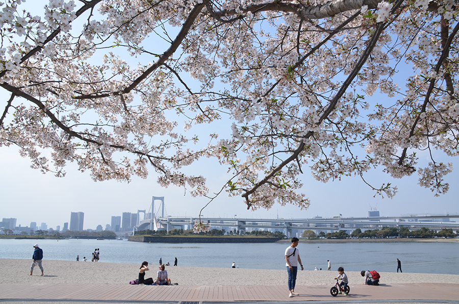 海辺のテラスからは、晴海のビル群を近くに、レインボーブリッジを遠くに眺めながら散策できます。周辺にはショッピングモールやミュージアム、キャンプ場など様々なスポットが点在しており、ウォーターフロントの魅力を満喫できます。