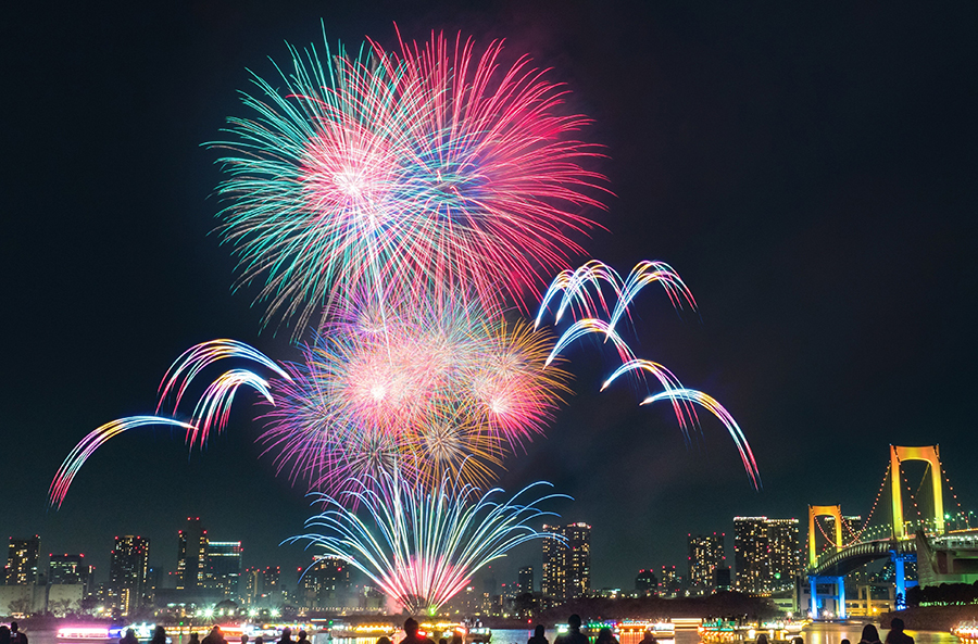 空気が澄み渡り、夜景がひときわ美しく見える冬のお台場を舞台に、花火がダイナミックに打ち上がります。ライトアップされたレインボーブリッジや東京の夜景をバックに、12月毎週土曜19時から約10分間、凛とした冬の空に大きな華を咲かせます。水面に移る花火も幻想的です。