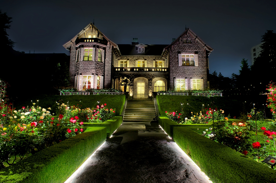 バラ園の奥にたたずむ大正時代に建てられた洋館と、その先には日本庭園が広がります。都心では珍しい和と洋が調和する庭園です。