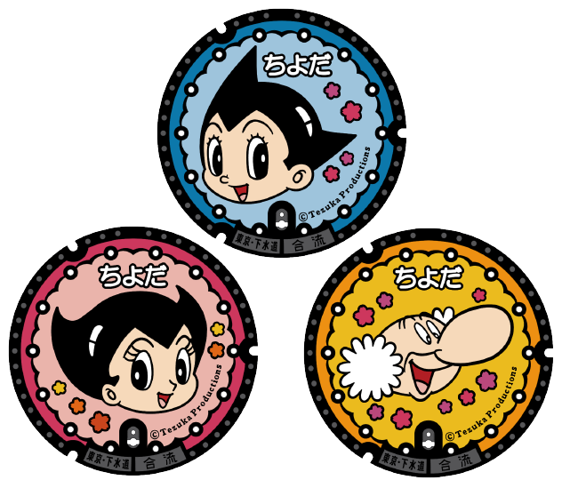 各自治体で導入が相次ぐデザインマンホール。千代田区内には手塚治虫の「鉄腕アトム」のキャラクターであるアトム・お茶の水博士・ウランのマンホールが設置されています。