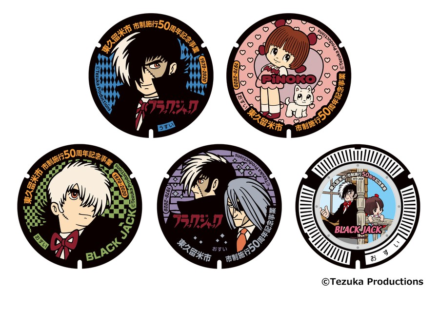 マンガ「ブラック・ジャック」の銅像及びデザインマンホール。作者であり漫画界の巨匠・手塚治虫先生が晩年東久留米市に住んでいた縁から、駅前西口にあるブラック・ジャック&ピノコ像を起点に市内に5か所デザインマンホールを設置しています。市内全体に設置しているため、二人で東久留米市の街並みを味わいながらマンホール巡りを楽しむことができます。