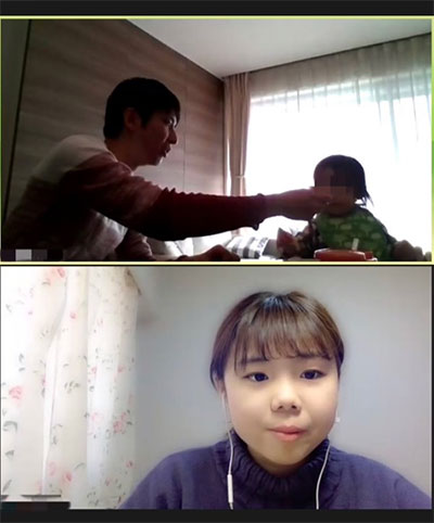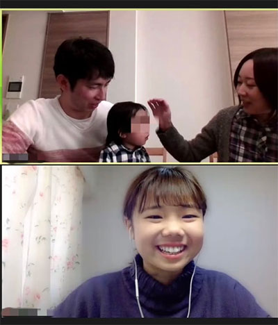 佐藤さんと中村さんご家族がそれぞれ自宅からZOOMで接続し、オンライン家庭訪問型プログラムがスタートしました。自己紹介をした後に、お互いに近況を共有しました。